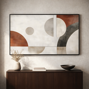 The combination of soft neutrals, warm browns, muted black, and balanced circular patterns adds depth and visual harmony. Inspired by celestial alignment and architectural symmetry, this geometric abstract canvas art enhances living rooms, bedrooms, offices, and luxury apartments with a refined yet contemporary aesthetic.