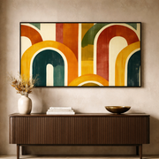 The geometric arch composition creates movement and balance, making this oversized canvas wall art perfect for modern living rooms, creative studios, dining areas, offices, and stylish apartments. The retro colour palette adds warmth and personality while complementing contemporary interiors.