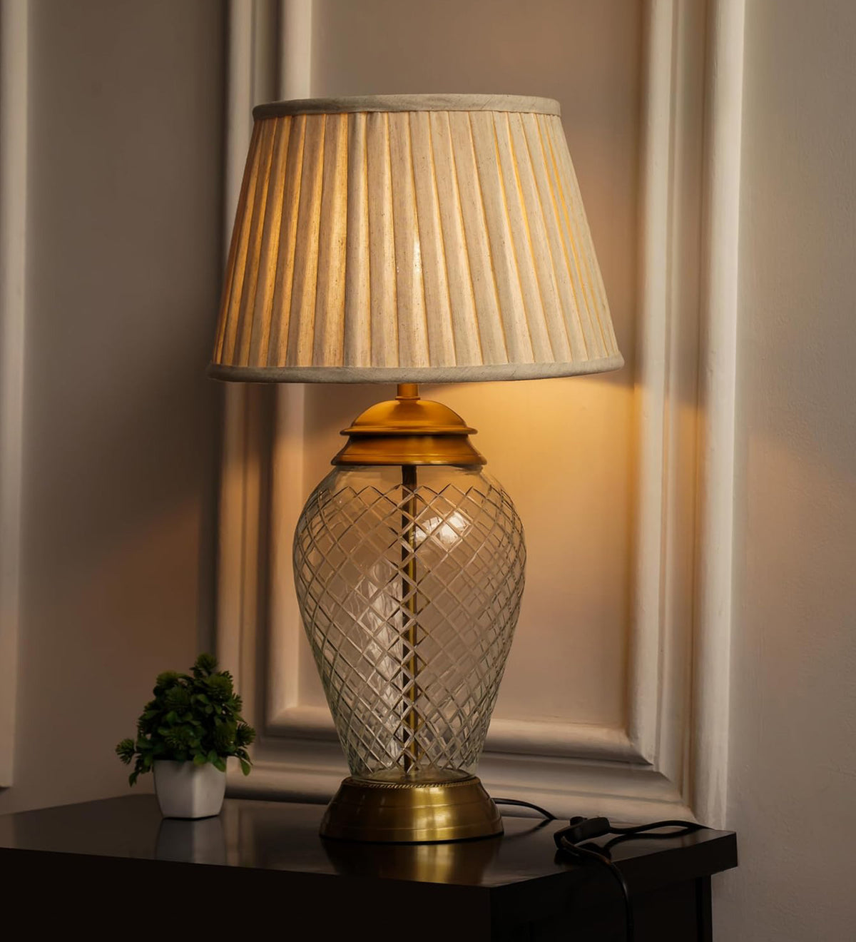 - This table lamp comes with an off-white pleated cotton tapered shade.