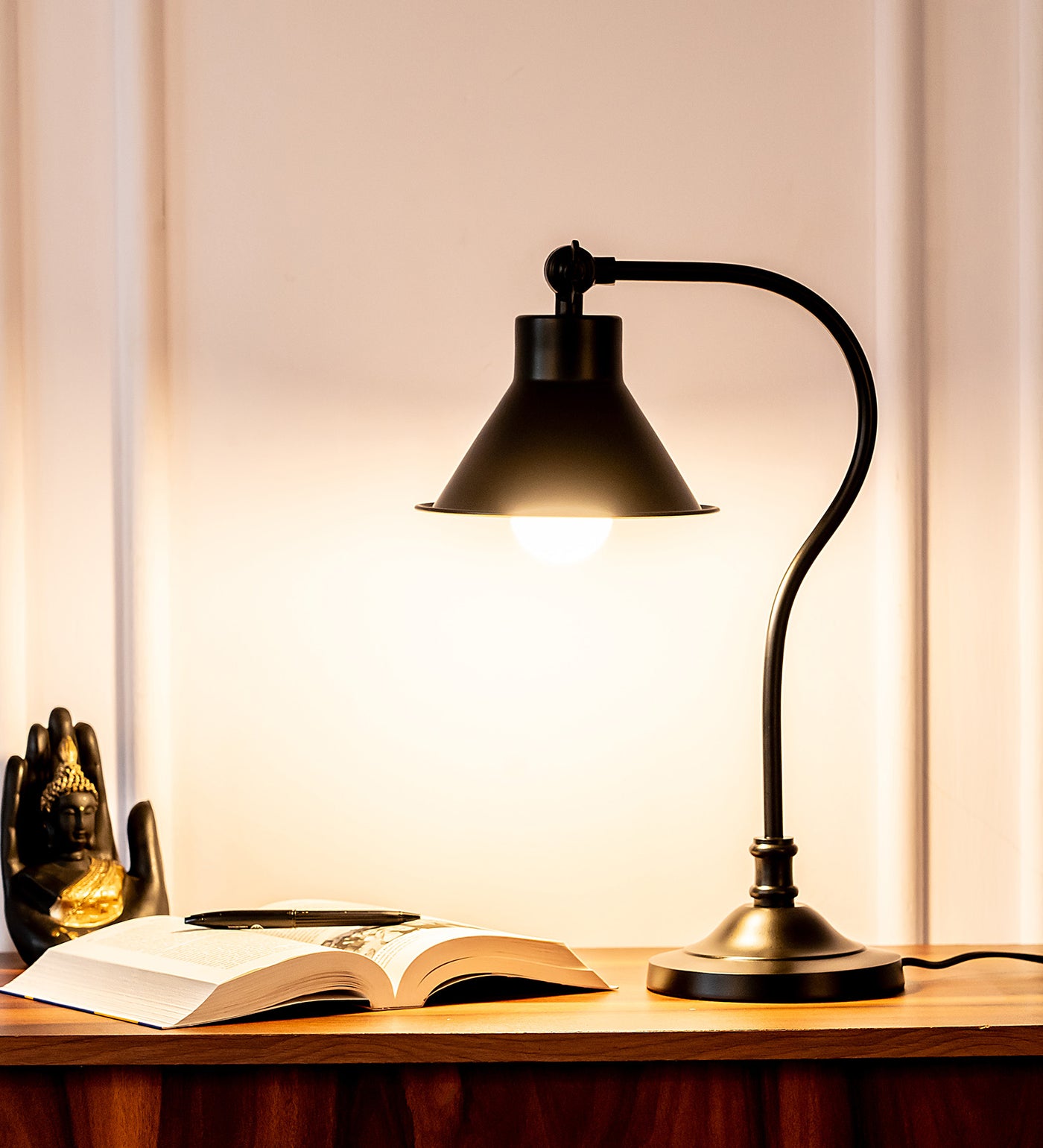 Overview: This black polished study reading desk table lamp is specially designed keeping in mind its functionality. It is ideal for an office, bedroom, and any place where you work. The lighting of this lamp is efficient and focused to provide the best reading experience. The top head of this lamp is adjustable. The lamp has a sturdy base. This lamp will enhance the aesthetics of your study table without compromising on the lighting. The lamp is made in India.